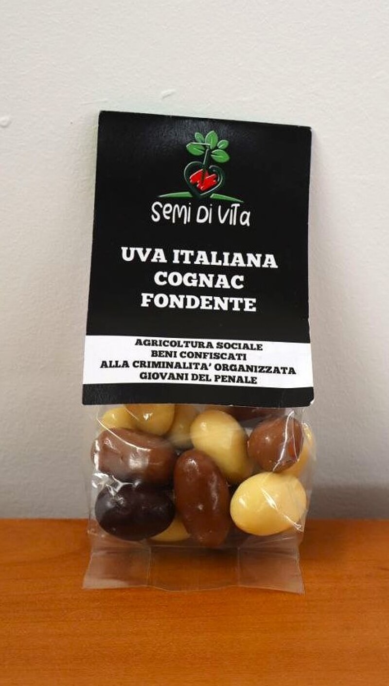 Ingredienti: cioccolato fondente (pasta di cacao, zucchero, burro di cacao, emulsionante: lecitina di girasole, aroma naturale di vaniglia, cioccolato al latte (zucchero, burro di cacao, latte intero in polvere, massa di cacao, latte scremato in polvere, emulsionante: lecitina di SOIA, aroma naturale), cioccolato bianco (zucchero, burro di cacao, latte intero in polvere, siero di latte in polvere, massa di cacao, latte scremato in polvere, emulsionante: lecitina di SOIA, aroma naturale), uva disidrata 20%, alcool, zucchero, gomma arabica, aroma cognac, gomma lacca. Non contiene glutine. Conservare in un luogo fresco e asciutto.